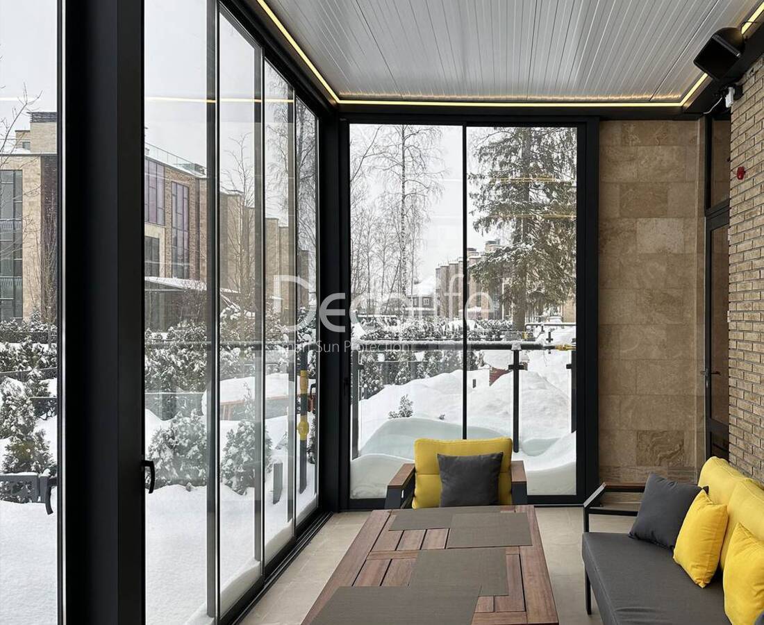 Пергола тентовая Decolife Basic&Pro New + Гильотинное остекление W500 + вертикальная система ZIP 100 - реализовано партнером "ООО Люкс Террас" - Московская обл.